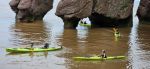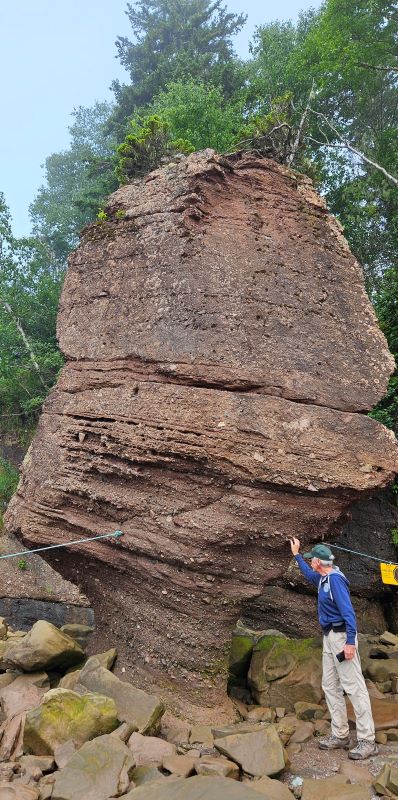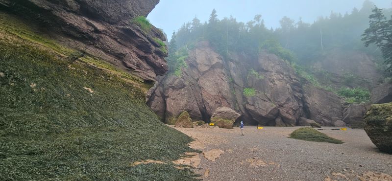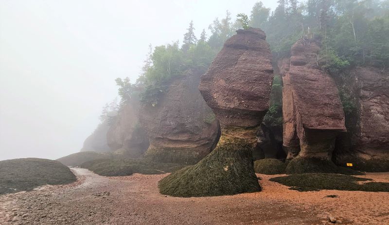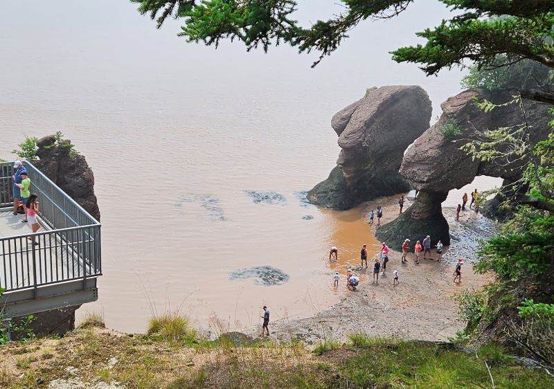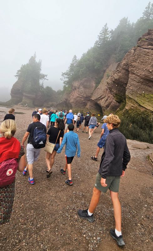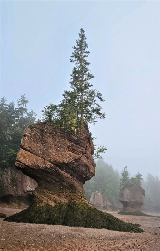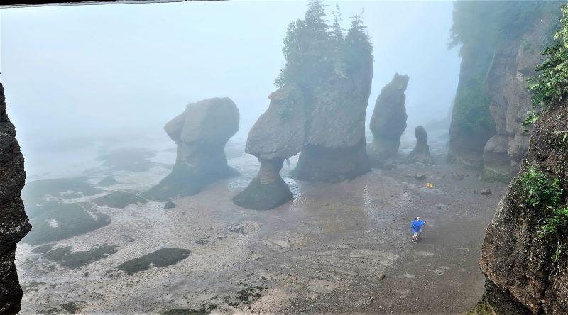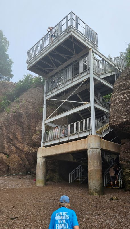 This morning we were up early and headed to Hopewell Rocks, about 45 minutes from Fundy National Park. Hopewell Rocks is a New Brunswick provincial park and is located on the Bay of Fundy. Hopewell Rocks, also called Flowerpots Rocks or The Rocks, are rock formations known as sea stacks, caused by tidal erosion by the massive tides of the Bay of Fundy. The formations are 40-70 feet tall. There are over 23 sea stacks standing along the shoreline of the park. The park is considered a “self-guided tour” but there are interpretive staff on the trails, the landings of the stairways to and from the ocean floor, and out among the sea stacks. They are very knowledgeable and are anxious to answer questions and share their love of the park. The stairs down to the ocean floor are 100 steps, one way. We made 3 trips up and down those steps today. We both got credit for 76 flights of steps on our fitness tracker and over 20,000 steps. That’s two days in a row of some serious exercise. It may be an Ibuprofen night tonight.