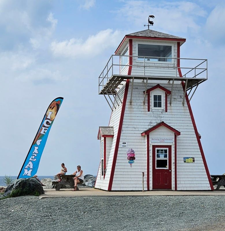 Next detour was at Arisaig to photograph a light house. It was no longer active and actually had an ice cream shop inside. We couldn’t buy any ice cream because we already had ice cream in Pictou. Arisaig seemed to be a lobstering town. Lots of lobster traps in the yard and a lobster processing house as well. Heading on further east our next detour was at Cape George to photograph that lighthouse. It really is a light house that is situated on a cliff above the St Georges Bay. What a great view of the bay!