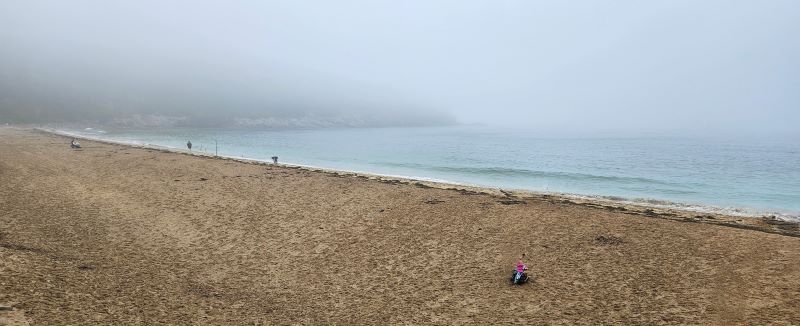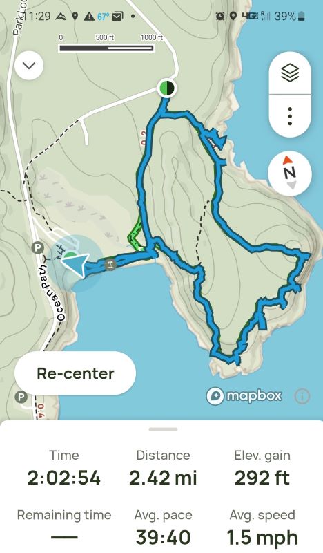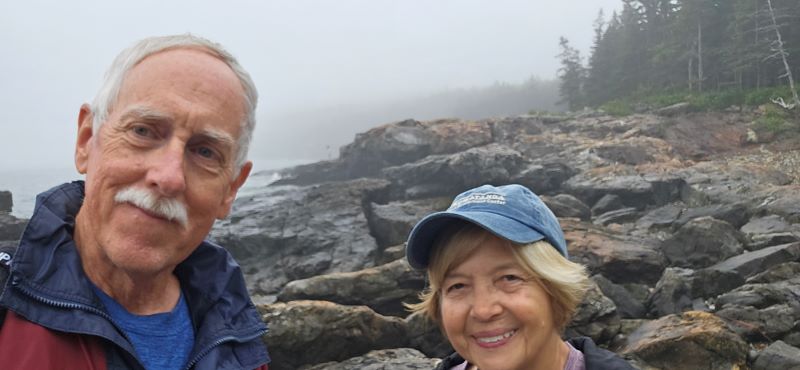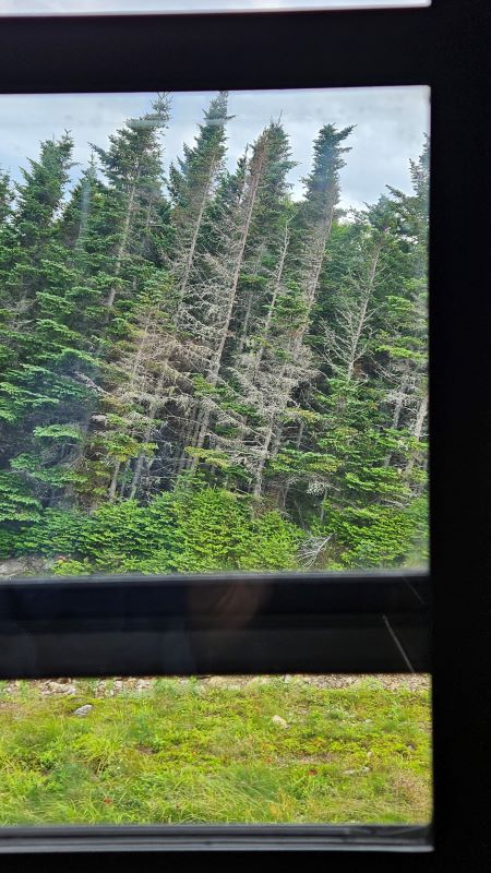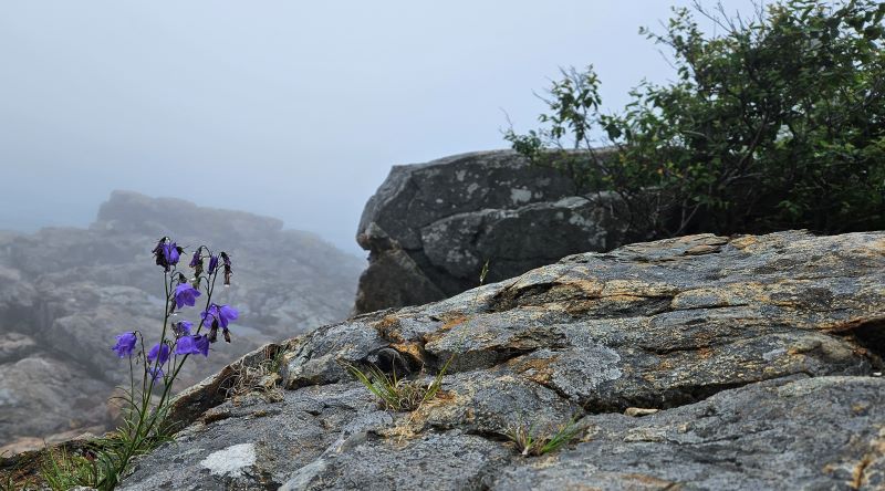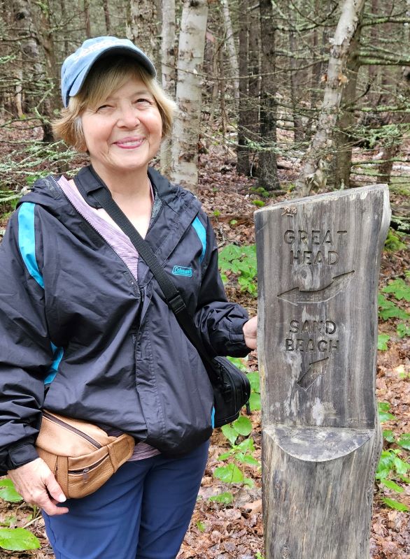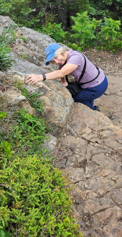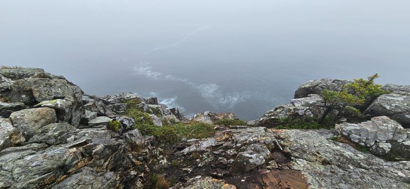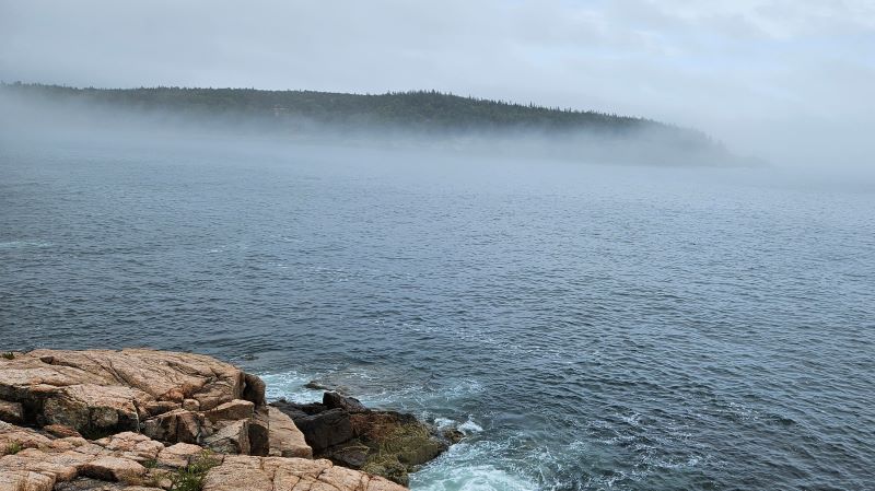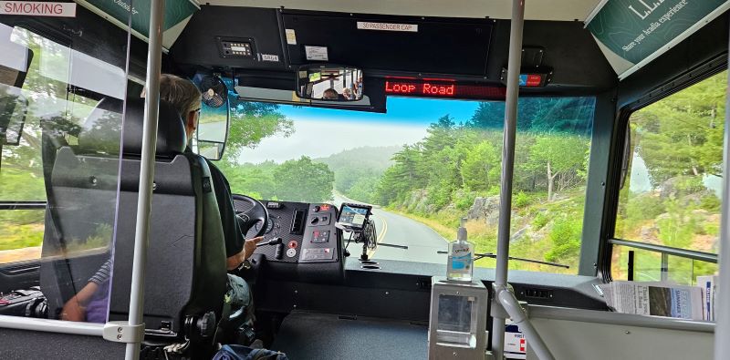 After a good night of rest in this quiet campground, we elected to use the Island Explorer bus system for our first day of visiting Acadia. The bus system is entirely free and you can visit everything in the park and go into Bar Harbor just by changing buses depending on what you want to see. We began as we usually do by visiting the National Park Visitor Center. You do have to have a park pass to enter the park but our lifetime geezer pass took care of that for us. The visitor center is very nice and we remembered to get our NP passport stamped while we were there. Then we changed to the park loop bus and headed into the park. It was a foggy morning and more so in the park. We exited the bus at Sand Beach and the trail head for Great Head Loop Trail. We were surprised after seeing all the cliffs and rocks at the lighthouses yesterday that there was sand at the beach. It was a very different and more course sand than the beautiful white Alabama gulf coast beaches. The trail had many look out points and we stopped at most of them. The trail had lots of roots and rocks, sort of like the Smokey Mountains and a lot of Alabama. It also had big beautiful ferns and flowers. As the day progressed the fog burned off and we had a little sunshine. At the end of the trail we had to do a little rock scrambling but overall it was a very nice trail to begin our exploration of Acadia.