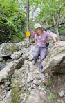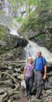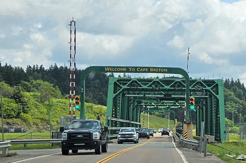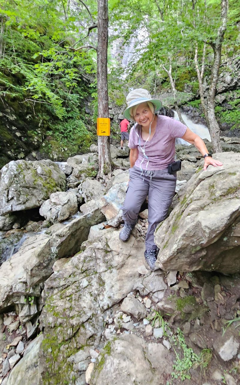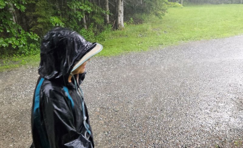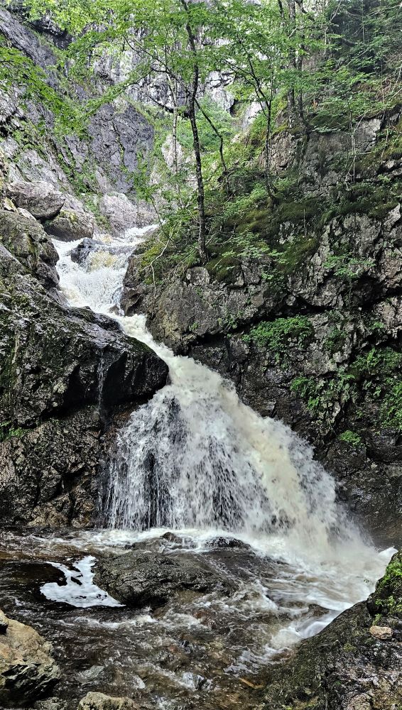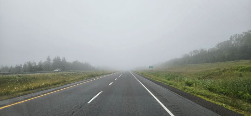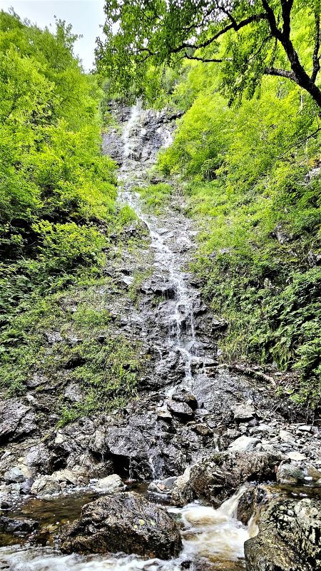 We decided to drive on to Cape Breton. It was so hot when we were here two weeks ago that we skipped some hikes we had on our to do list. Today we decided to hike to Uisge Ban Falls (pronounced OOSH-KA-ban, ISH-KA-ban, or Eeesh-kah-ban) and is Gaelic for “white water”. Cape Breton has very strong Irish and Scottish roots. The hike is rated moderate on All Trails and that is probably about right. Currently the road into the Provincial Park is closed due to a washed out bridge so we had to walk down the road and over the closed bridge to get to the trail head. The first portion of the actual trail is easy with a nice gravel path to follow. Closer to the falls there are rocks and boulders to climb over or around to get a good view of the falls. You then arrive at a tall waterfall in a beautiful granite gorge that today had a lot of water flowing over it. It was a great hike with a really good payoff for the effort. Our total hike was 2.8 miles. However, about 2/3s of the way back to BB, it began to rain – really rain. We were drenched. Sure glad we had BB with all our clothes.