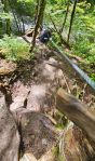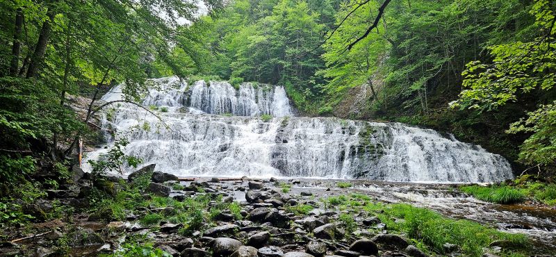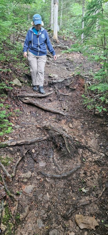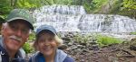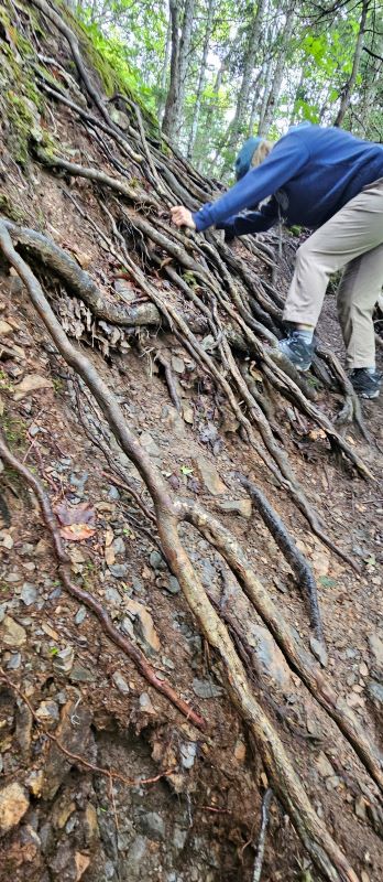 This morning after another “see you down the road” to Lynn, Owen and Maggie we went on another hike we had skipped when here last, Egypt Falls. It’s not a very long hike and is listed a moderate on All Trails but it’s a pretty tough hike. It’s just pretty much all down hill from the start and therefore all uphill on the return. There are several places where there are ropes to use to keep you from sliding down the hill or help you get back up. We needed the ropes a few times. It was also a little muddy and slippery today. However, the payoff was tremendous. This is now our favorite water fall in Cape Breton, and probably of this trip.