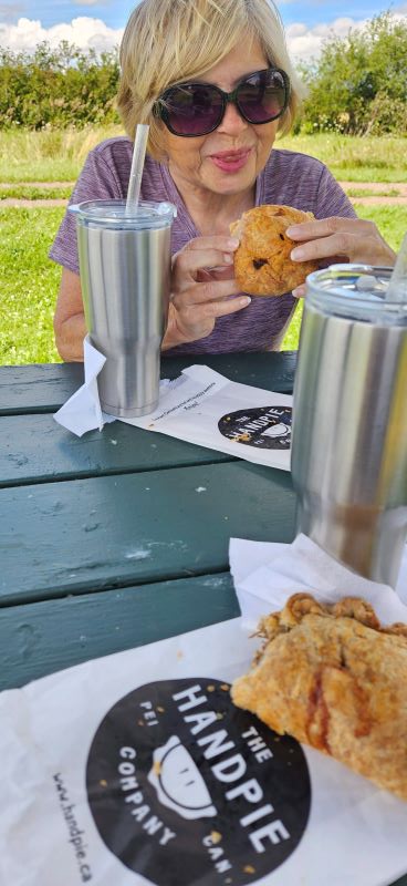 After visiting the church, we visited a couple of beaches. Both beaches today were red sand beaches. We spent most of our time at Gordon Gove Beach. Very pretty and we do love to walk on the beach. From the beach we drove to Albany, PEI, home of the Hand Pie Factory. We did get to watch the pies being made. Hand pies are similar to a pot pie but the pastry wraps around the filling so it can be eaten with your hand like a sandwich. They are so very good! Think we will have to stop back by when we leave the island in a few days.