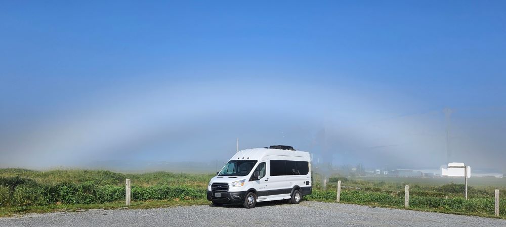 We woke up sometime during the night hearing the sound of a fog horn. It was sounding every fifteen seconds. It sounded far away, wasn’t very loud and we just went back to sleep. When we got up this morning it was still very foggy so we took the time to cook a good breakfast and do a little maintenance on the van. Then we walked out to the beach once more. When we returned, there was a rainbow in the fog over our van. Wow, what a special blessing from our Lord.