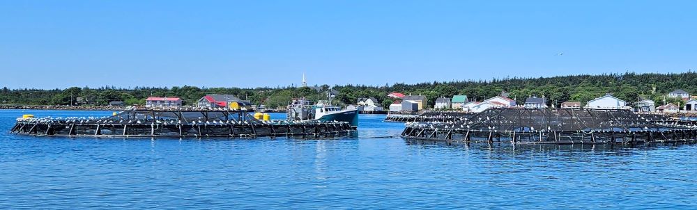 This is a salmon farm in the harbor on Brier Island. Salmon fingerling are placed in the large cages and harvested when the reach a certain size.