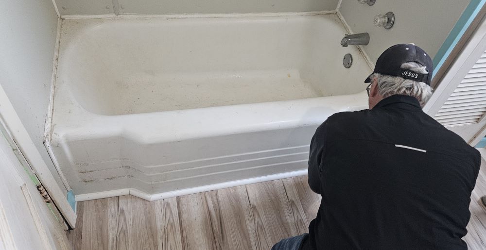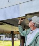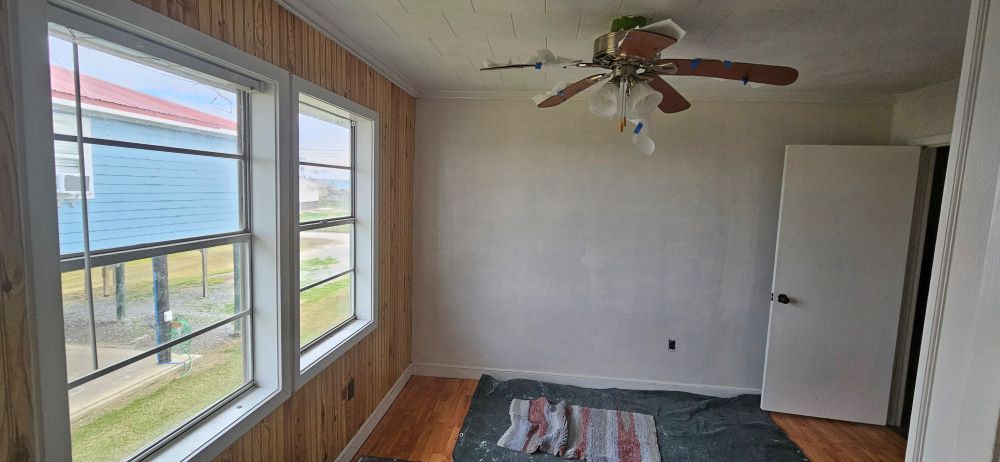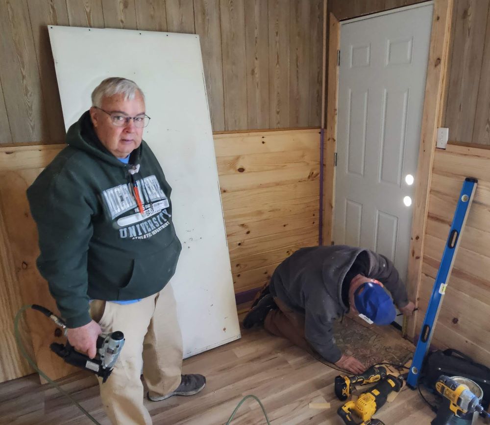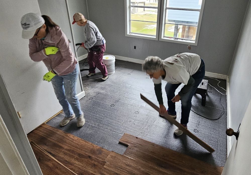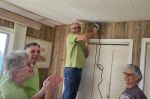 When we began the work week it was still too wet to go back to Bozo’s for painting, so the entire team began our work on Peanut’s house – a new jobsite for the NOMADS. We made good progress, completing the removal of the bedroom flooring and began the installation of the new flooring, removed the window trim, removed quarter round, patched the kitchen floor, and began the arduous task of scraping and sanding the outside spindles and railings. By the end of the week, the railing and spindles were repaired and painted, the bedroom flooring was completed, paneling was installed and the ceiling and walls painted. The kitchen flooring is almost complete.