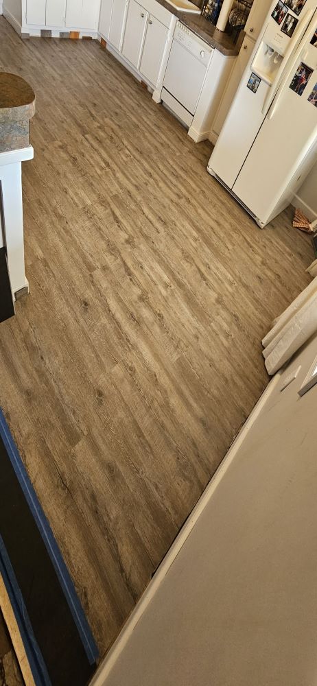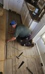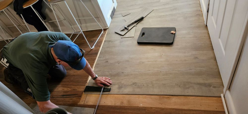 Jack had to make a lot of extra notches and special cuts for the kitchen flooring.