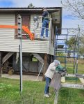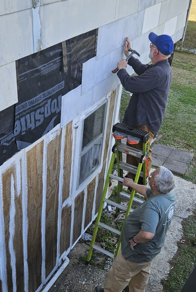 Michele, Ken and Sherry installing siding on Olga’s house.