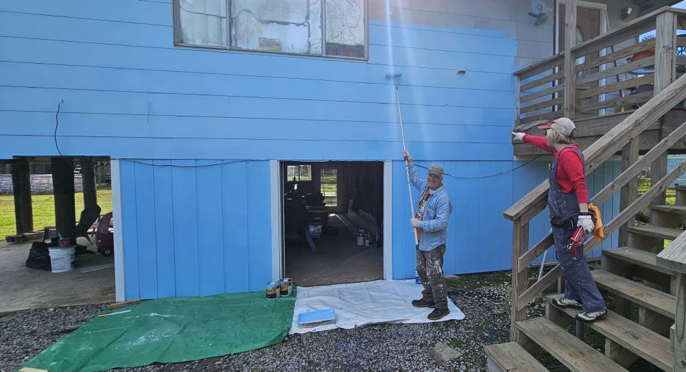 By Tuesday it was dry enough to return to Bozo’s to resume the exterior work there. There was lots of painting and sanding, installation of new outside lighting, painting of baseboards. Next week we hope to have a lift available to complete a little more painting at the highest points and repair and paint the fascia and soffit.