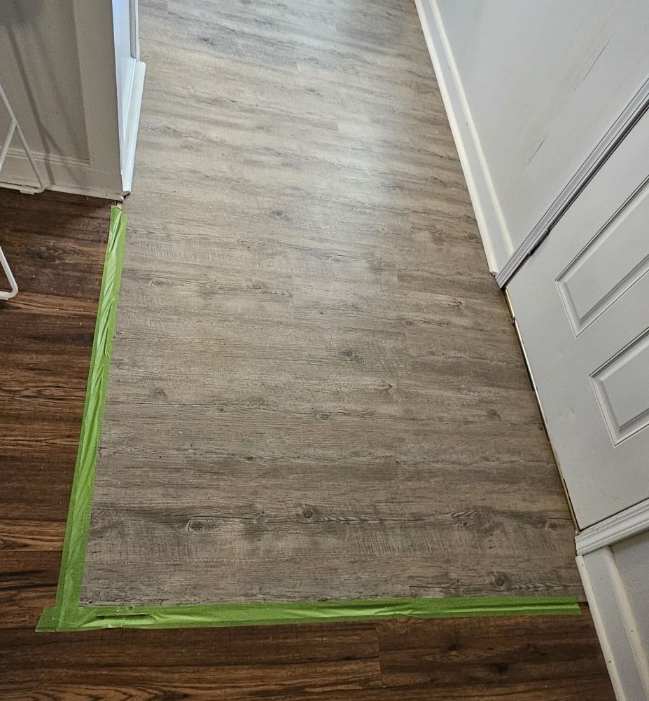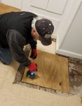 Jack preparing the floor for the kitchen flooring to extend out into a landing inside the front door.
