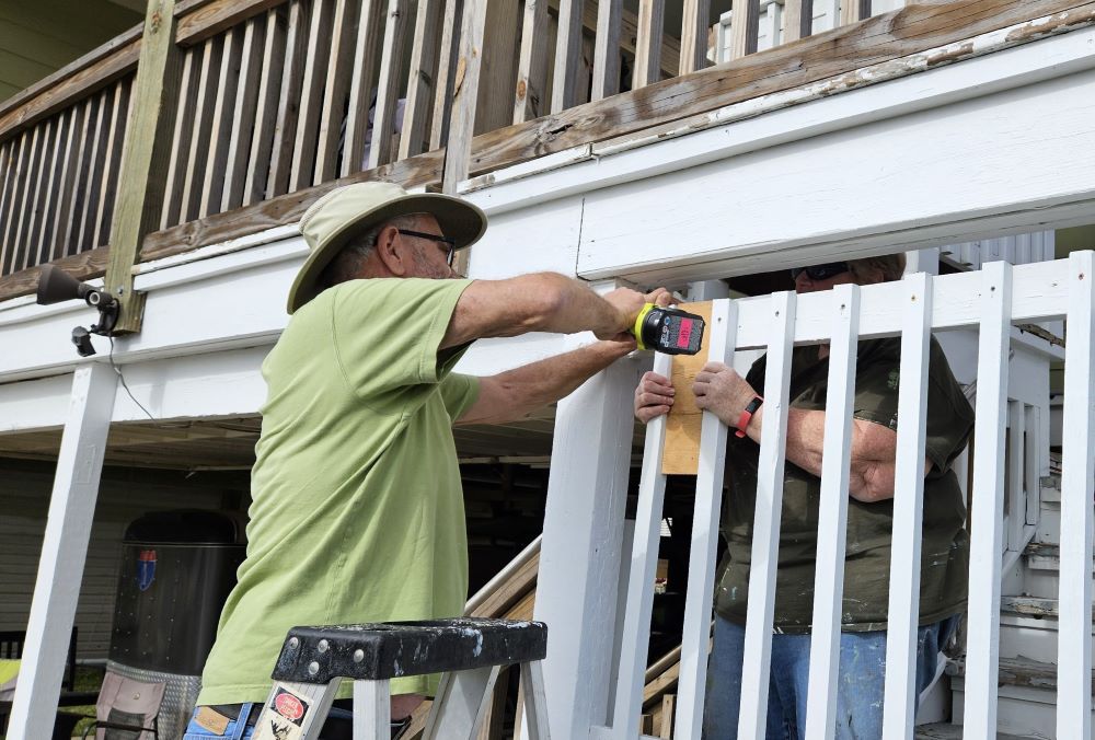 Dan and Barb installing the new balusters that Dan made and Barb painted.