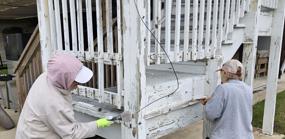 Michele and Anne scraping the stairs and railing. Our assignment was to just paint the parts that were painted before. Dan and Virgie also spent a lot of time scraping.