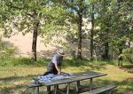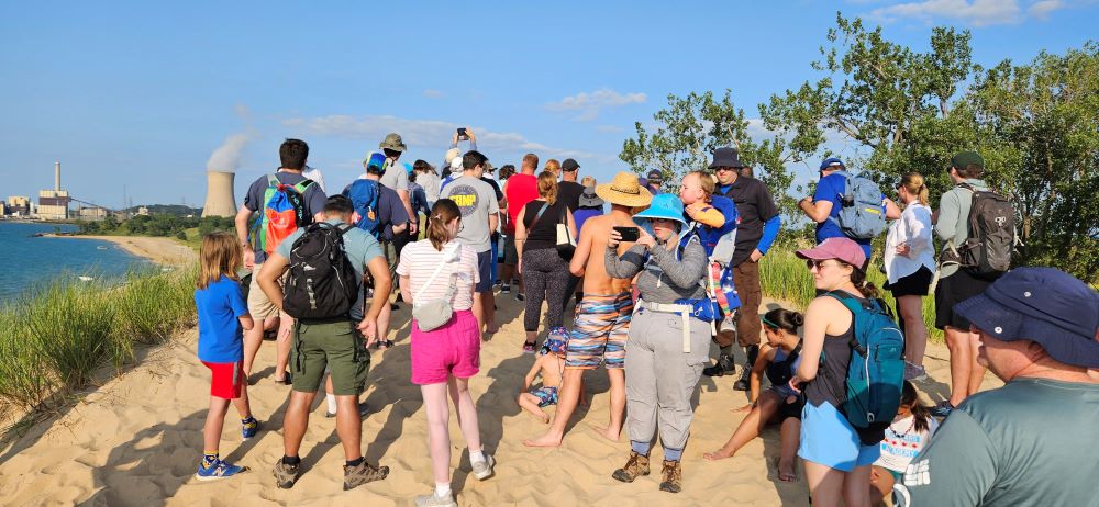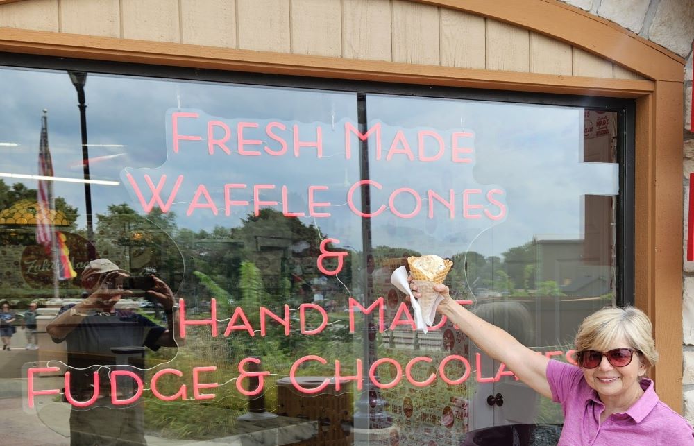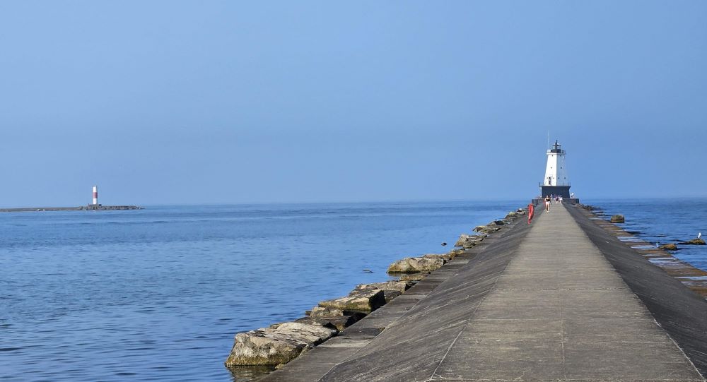It took a while for the fog to begin to burn off, but when it did, we drove out to Ludington’s North Breakwater Light. It is ranked the number one lighthouse to visit in Michigan. The concrete break-wall leading out to the light is popular with fishermen and those who enjoy walking the mile-long round trip. This morning there were many like us getting their morning exercise and enjoying beautiful clear water of Lake Michigan. It’s easy to forget you are looking at a lake and not an ocean. There were already fishermen out today as well, but we never say anyone bring in a fish. 2024 is the 100th anniversary of this light. It’s open to the public for viewing daily and since the light sits on top of the big breakwall, there are only 53 steps to climb.