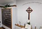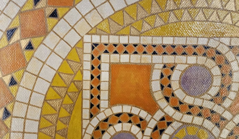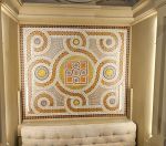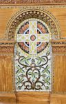 There are many mosaic decorations around the sanctuary such as this panel behind the pulpit. They look like tile …