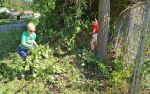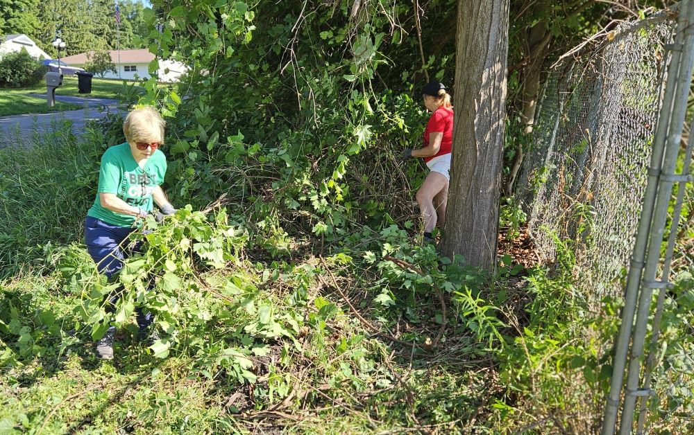 After our opening dinner on Thursday night, we were up early Friday for breakfast and then off to work at our “give back”. We had three projects for the village of Bath. About twenty-five worked with us at the school, clearing a fence row – a long fence row. Others worked downtown at the city park. There one group worked painting a gazebo and another group cleared out around the trees and put in mulch.