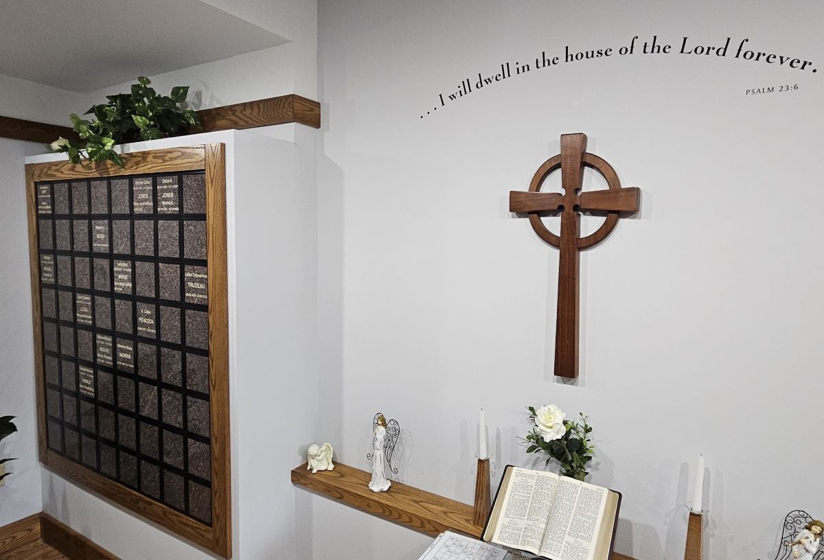 Scripture and embossed metal details around one of the Tiffany glass windows above the pulpit