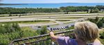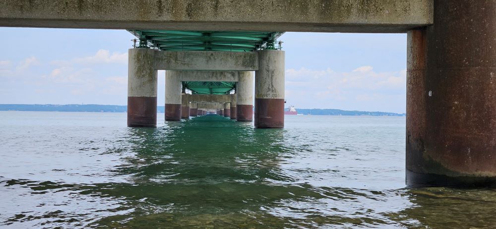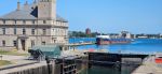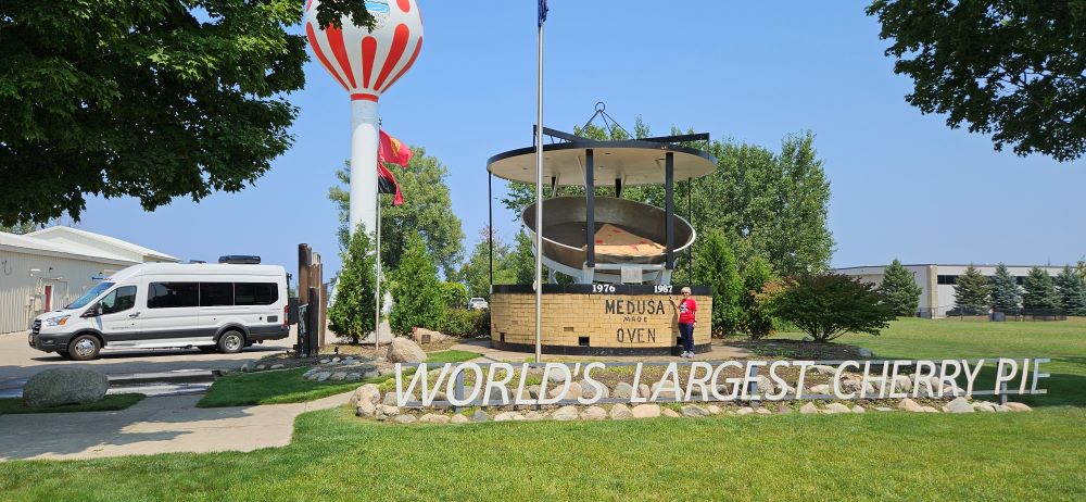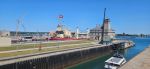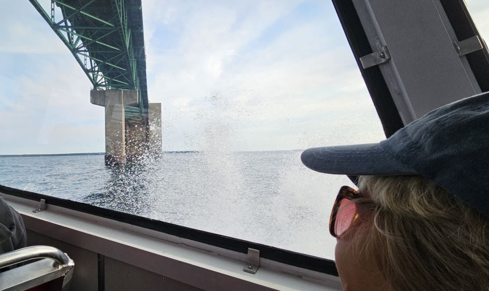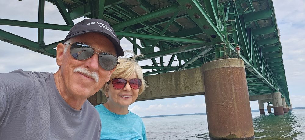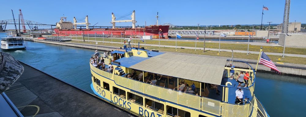 The real purpose of this little side trip was to get to the Soo Locks in Sault Ste. Marie, Michigan. This has been a long-term bucket list item. A lot of you probably don’t know that we owned a boat at one time and considered buying a larger boat and doing the Great Loop instead of buying an RV. That’s when we learned a lot about the locks and dams and became interested in the Soo Locks. The Soo Locks raise and lower boats between Lake Superior and the lower Great Lakes and complete more than 7,000 vessel passages every year moving over 75 million tons of cargo. Vessels locking through vary in size from small private boats to 1,000 foot long ships carrying up to 77,000 tons of freight in a single load. Currently there are only two locks operational because two others were torn out and they are building one larger lock. There is a large viewing platform where you can watch the huge ships and small boats like we owned, lock through. Interesting to us was that the huge ships lock through basically the same as we do in a little boat. Anyway – it was a fun afternoon for us.
