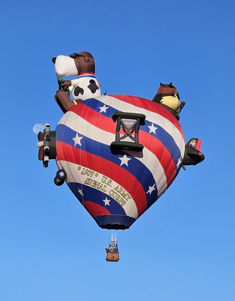 Saturday was our day to spend at the BalloonFest. We were up early to be able to see the first balloons go up at about 7:30. There were about 25 balloons in the morning flight and there was a competition to see which pilot could drop their streamers closest to the center mark. Later in the day there was a mass ascension of balloons and later still there was an evening glow. It was a day of great fun. We particularly enjoyed the special shape balloons.