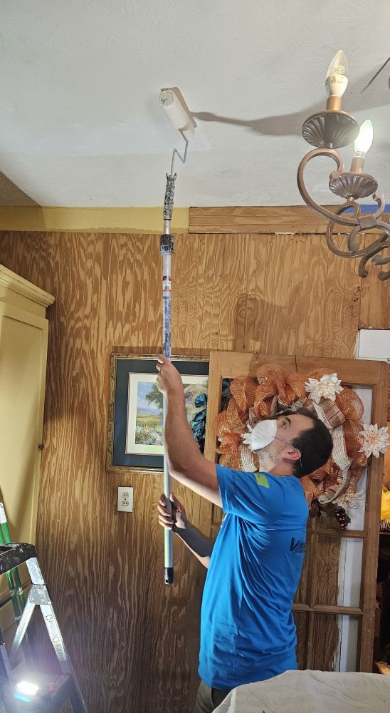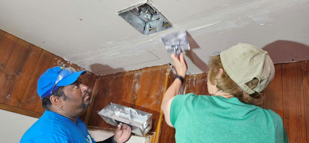 We were at the fourth house both Thursday and Friday. It needed exterior siding to be replaced and bathroom flooring and ceiling repairs. The house next door had burned, and the fire damaged the siding on about half the right side of our house. We had two volunteers that had some experience with siding and after we helped them get started, they moved right along, mostly completing that job by Thursday afternoon. The two ladies working on the floor in the small bathroom seemed to really enjoy learning new skills. They had never used the tools we used to removed three layers of subfloor to repair damage from a leaking toilet. They worked hard on a dirty job and we got most of the subfloor and the toilet reinstalled before the end of the day so our homeowner had a working bathroom. Friday we assisted the team in installing the last of the subfloor, installing a ceiling fan and removing the ceiling tiles and replacing them with drywall. Anne even taught a beginning class on taping and mudding the ceiling.