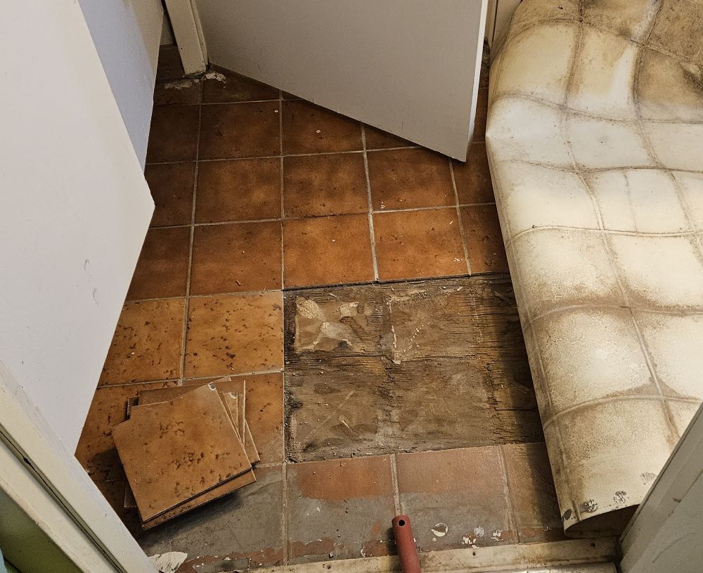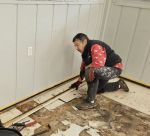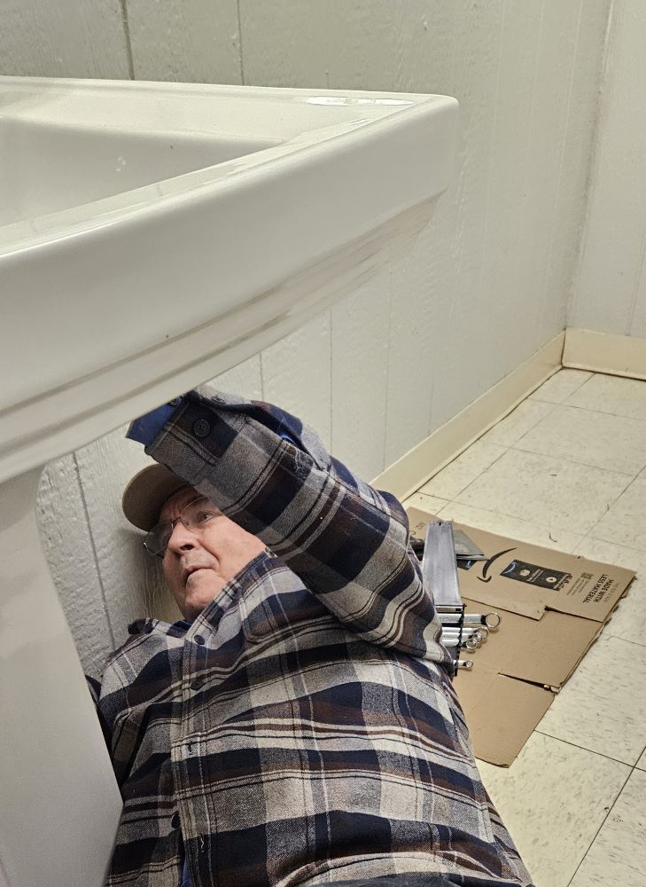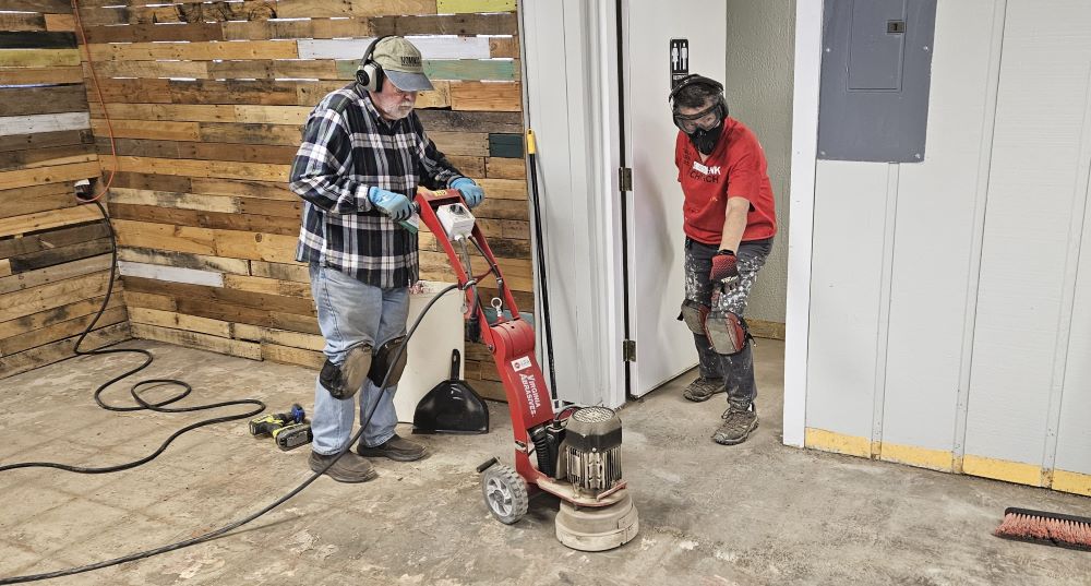 There is lots of work to be done at the camp, but our highest priority is replacing the flooring at the pavilion. Monday morning it was all hands-on deck to empty out the pavilion of all the sound equipment, furniture, etc. and remove the toilets and sinks from the restrooms and store everything in a nearby building. That done, we began using various tools to remove the old flooring. Most of the tile actually came up fairly easily. It was all the glue that remained on the floor that was the problem. The camp director rented us a machine that made the job easier but there was still lots of time spent on our knees scraping. It was decided that we would be using epoxy paint with color chips to replace the old tile. After scraping all the old glue up there was dust and dirt everywhere. Then, we began the process of cleaning the concrete mopping numerous times to get it clean. With that huge job completed, Thursday afternoon we etched the concrete and then mopped the concrete until clean again. The mop water had to be clear. That’s where we left it for the weekend.
