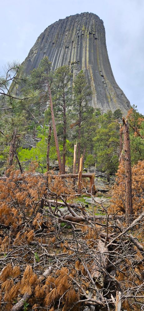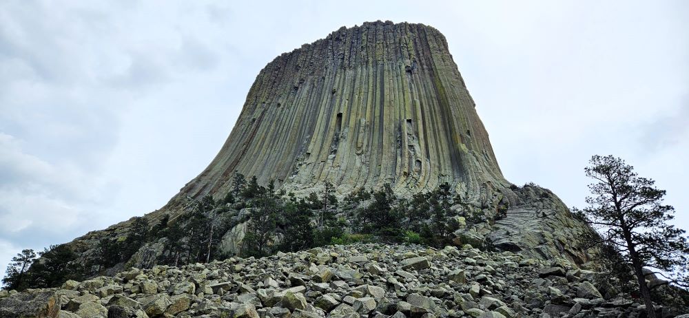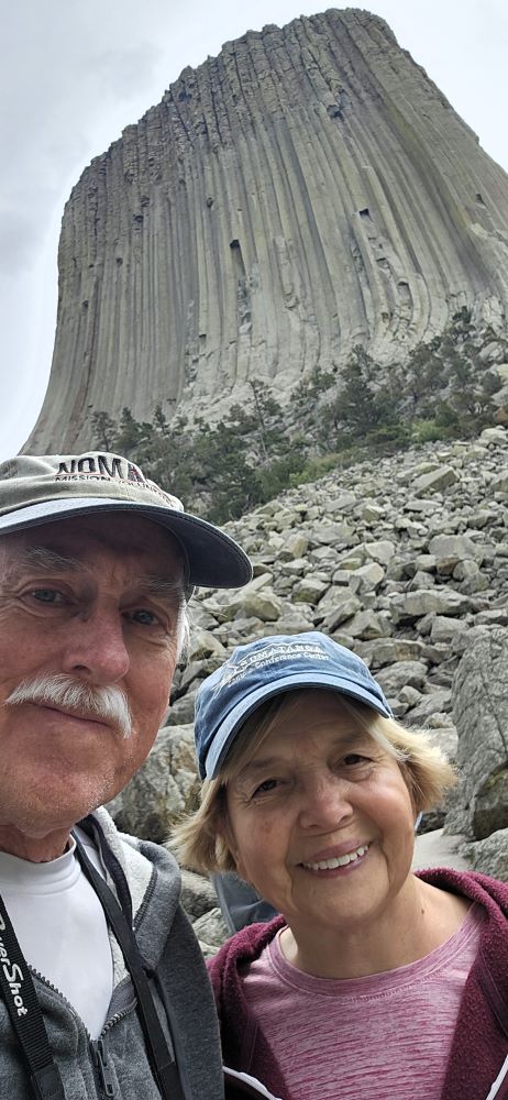 As we left Custer and Randy and Debra behind, we had very few fixed plans. We knew generally the direction and some of the places we wanted to visit. We did not have reservations or fixed stops. We drove from South Dakota into Wyoming and noticed a “brown sign” (park service sign) mentioning Devils Tower. A few miles further was the turn and since we had not had time to stop at Devils Tower when we were returning from Alaska, we decided this should be the day. We remembered hearing some news about some storms in the area but no details. Wow! There was a lot of damage. The ranger said they had an EF-3 tornado and straight-line winds up to 150mph last year. There were over 300 mature trees damaged. But Devils Tower still stands! And we enjoyed our quick hike around the bottom.