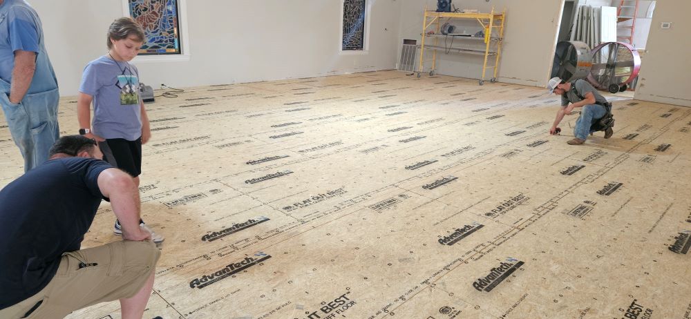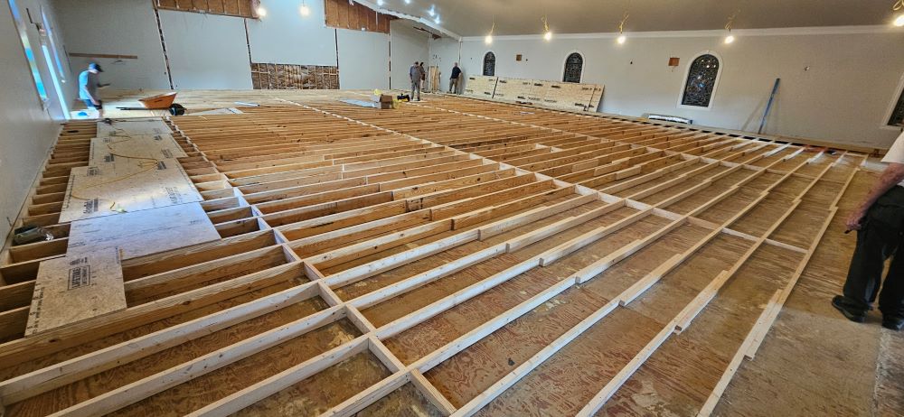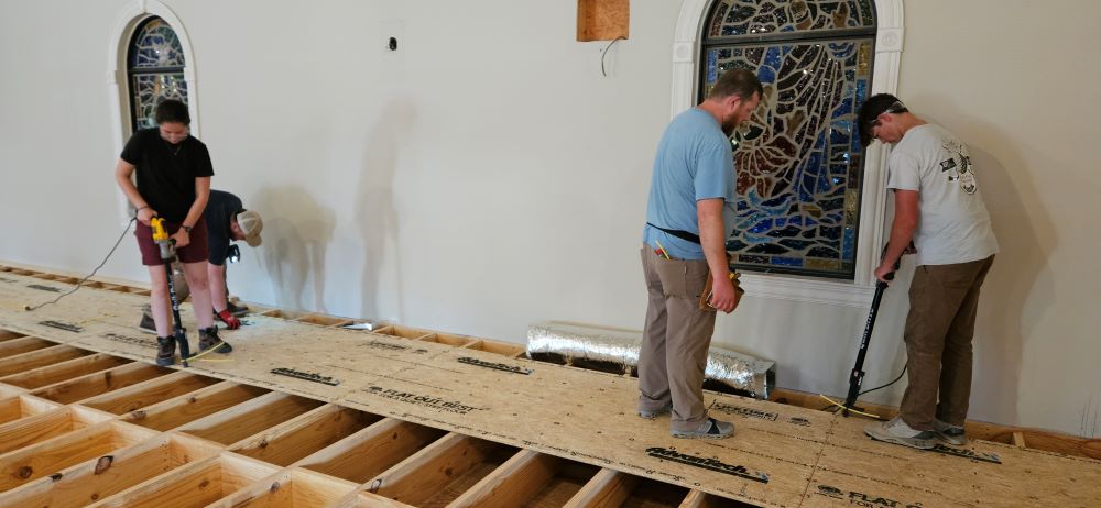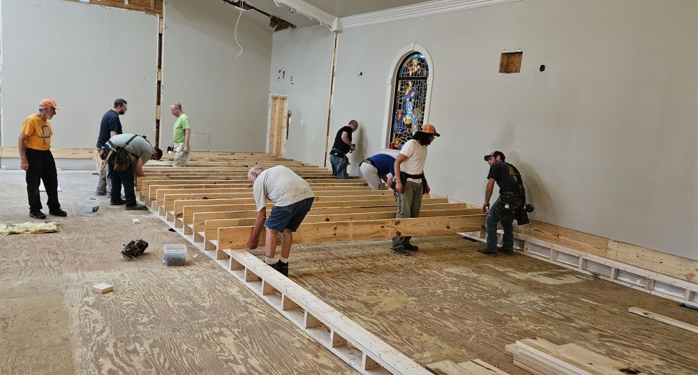 Monday morning and every other morning we were on the job site working by 6:00am. We had breakfast at 7:30, Lunch at 12:30 and Dinner at 6:00 pm. All the job site work was in the old sanctuary this week. As always, we were very blessed to spent a week in service with our friends and family. God is good!