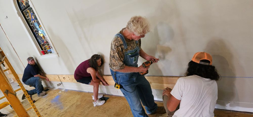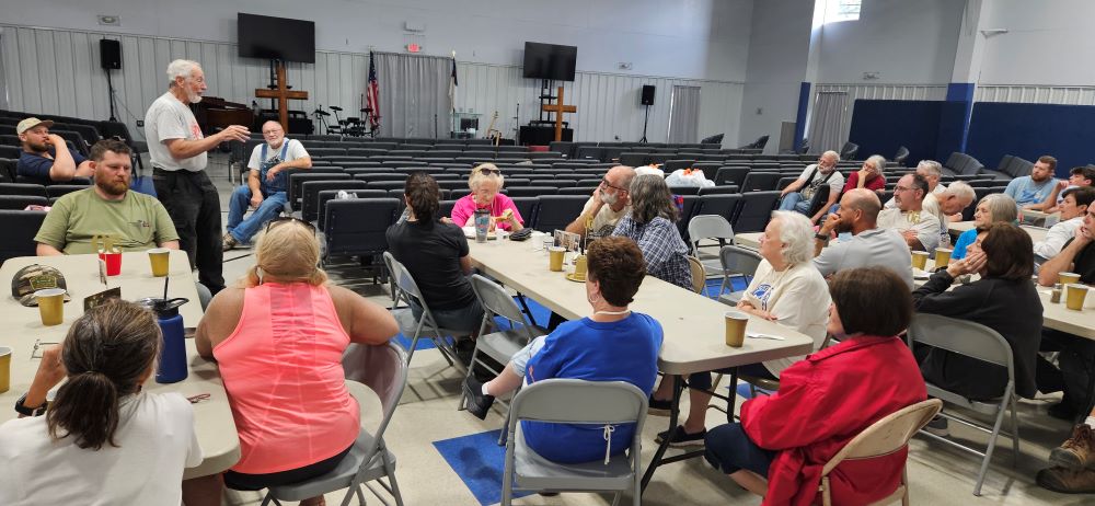 Saturday morning we got to sleep in – 7:00am – because we didn’t have to be at work until 9:00. Anne and Debra worked, along with some other ladies, moving cooking equipment from the trailer into the church and setting up the kitchen and doing some general cleanup, before everyone arrived on Sunday. Anne and Debra were also responsible for the merchandise table again this year so they spent a good deal of time working on that. Randy and Max along with some other guys began working in the old sanctuary, leveling the floor and readying the site for the rest of the crew. This year we actually have two job sites that are next to each other. The old sanctuary is being converted into classrooms, and the new sanctuary is being built next door. Unfortunately, due to way too much rain this spring, the concrete had not yet been poured nor the metal building erected for the new sanctuary. Sunday morning we worshiped with the members of East Barbourville Baptist . Such a welcoming community! We then returned to our campground to ready ourselves for a busy work week – gathering up tools etc. Sunday evening we had our opening meeting and were able to reconnect with more friends.
