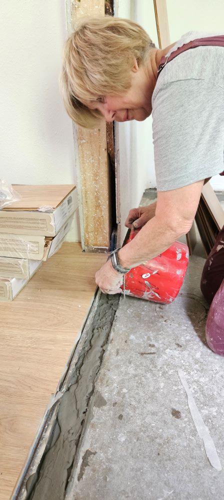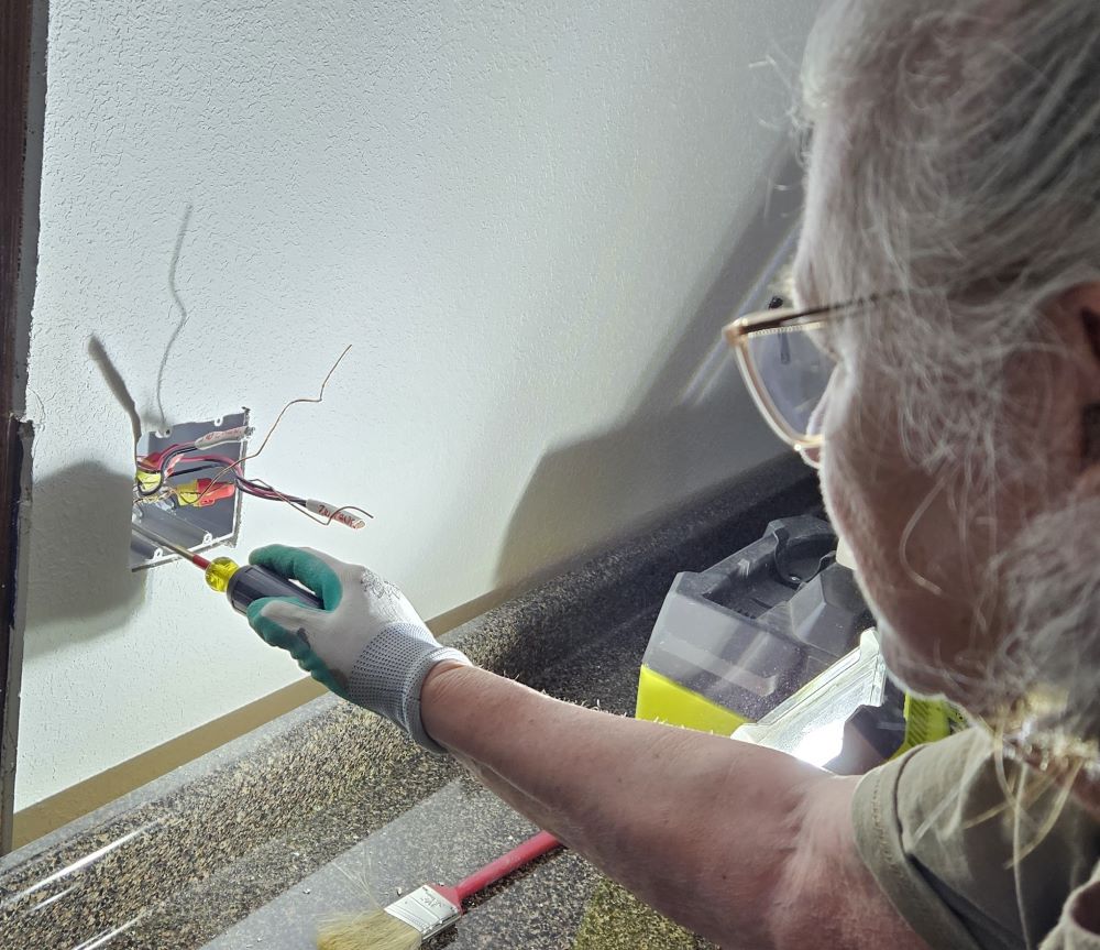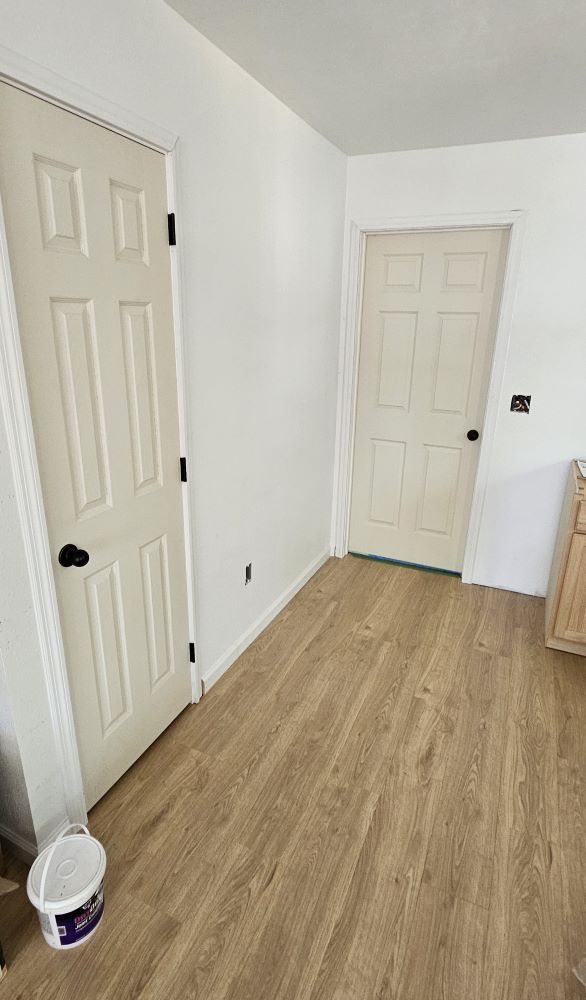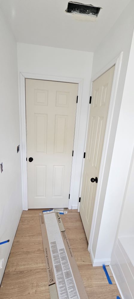 Monday had us returning to the Turpin Hill house. We all worked hard at this location all week. We completed all the flooring, painted and installed all the baseboard we could until the kitchen is completed, installed seven doors, trimmed out nine doors, and installed seven lock sets. We also installed decorative shutters on the front of the house, cleaned all the electrical boxes and panel per inspector’s report, and cleaned up inside and outside the house.
