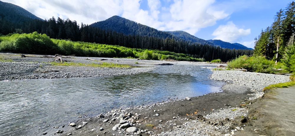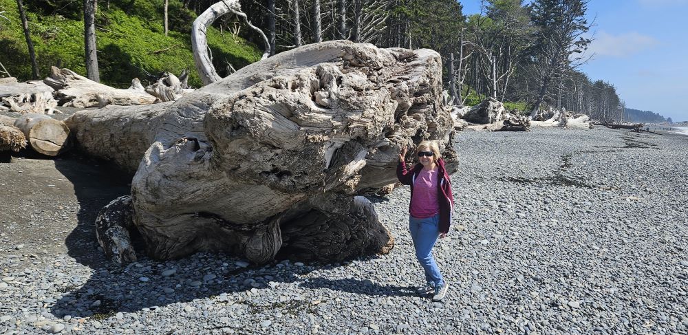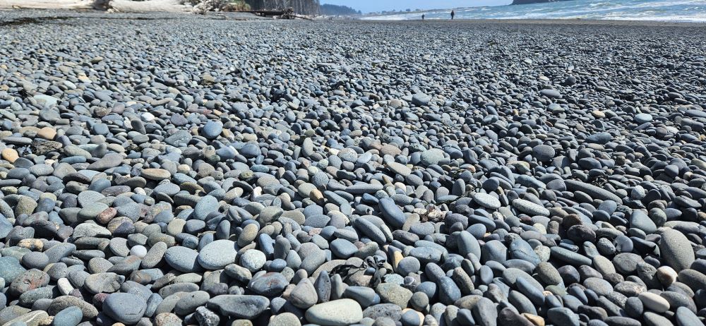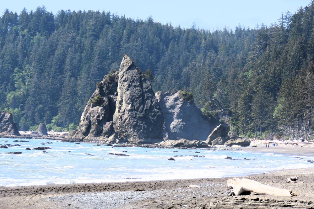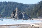From Hurricane Ridge we headed to Rialto Beach (also part of Olympic NP) on the recommendation of a volunteer at the visitor center. It is a pebble and rock beach, with a coastal forest and lots of driftwood. Rialto Beach is known for its sea stacks, rock formations and pounding waves. No swimming though. The rocks make for some difficult walking.